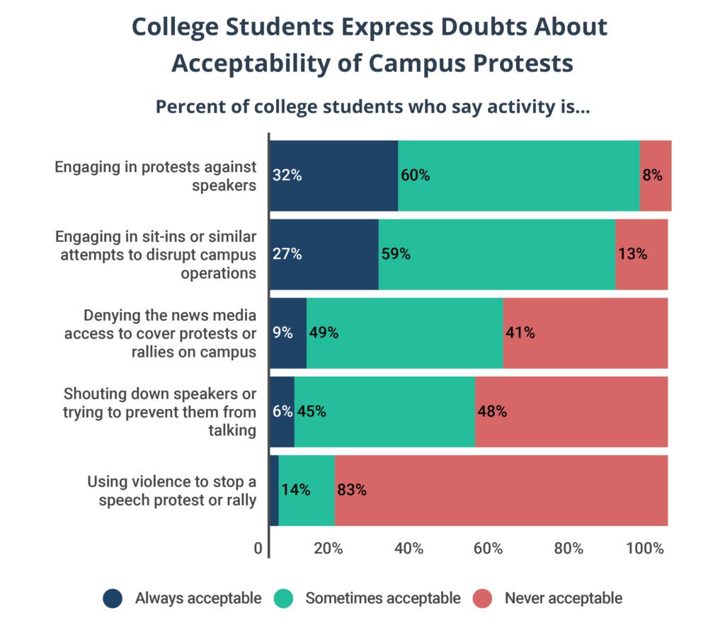 One question was whether students agreed with shouting down speakers or trying to prevent them from talking. While the results showed only 6% responded that it is “always acceptable,” 45% of students said it is “sometimes acceptable.”
