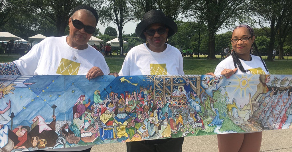 The copy of the illustrated Bible that was unfolded stretched all the way around the Reflecting Pool. Volunteers arrived early in the morning to take their place along the Mall to hold sections of the Bible.