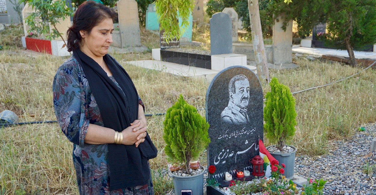 As the setting sun in the west illuminated the low mountains to the east in soft, end-of-day light, Sourya Pairwan stood beside the grave of her husband, Hasham Azizi, a leader of the Kurdish Democratic Party of Iran, or KDPI, who died during an Iranian missile strike in September.