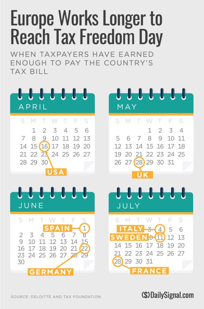 Germany is not alone in Europe when it comes to high taxes. European workers have to work on average more than two months longer than Americans to pay the taxman. In France, they have to work for more than half the year, twice as long as Americans.