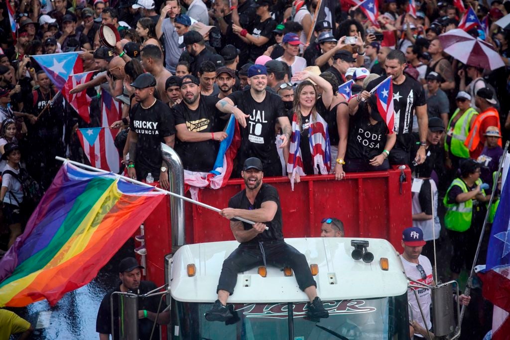 Puerto Rican singer Ricky Martin, center, Puerto Rican rapper Rene Perez, aka Residente, right, and Puerto Rican reggaeton singer Bad Bunny, top, take part in a demonstration demanding Gov. Ricardo Rosselló’s resignation in San Juan, Puerto Rico, on July 17. (Photo: Eric Rojas/AFP/Getty Images)Thousands of demonstrators protest against Gov. Ricardo Rosselló on July 17 in front of the Capitol Building in Old San Juan, Puerto Rico. The sign reads: “Ricky resign.” (Photo: Jose Jimenez/Getty Images)Demonstrators walk down the Las Americas Expressway, the biggest highway in Puerto Rico, as part of a massive march against Gov. Ricardo Rosselló on July 22 in San Juan, Puerto Rico. (Photo: Angel Valentin/Getty Images)Puerto Rican singer Ricky Martin, center, alongside Puerto Rican rapper Rene Perez, aka Residente, march along Las Americas highway as they take part in a national strike demanding Gov. Ricardo Rosselló resign in San Juan, Puerto Rico, on July 22. (Photo: Eric Rojas/AFP/Getty Images)A demonstrator with makeup depicting tears running down her face before the start of a massive march on July 22 in San Juan, Puerto Rico. (Photo: Angel Valentin/Getty Images)Demonstrators walk down the Las Americas Expressway, the biggest highway in Puerto Rico, as part of a massive march against Gov. Ricardo Rosselló on July 22 in San Juan, Puerto Rico. (Photo: Angel Valentin/Getty Images)Protesters fill the street as they demonstrate against Gov. Ricardo Rosselló on July 19 in Old San Juan, Puerto Rico. (Photo: Joe Raedle/Getty Images)People march along Las Americas highway as they take part in what is expected to be the largest in a wave of demonstrations demanding embattled Gov. Ricardo Rosselló’s resignation in San Juan, Puerto Rico, on July 22. (Photo: Eric Rojas/AFP/Getty Images).Protesters demonstrate near a police barricade on a street leading to the governor’s mansion as expectations remain high that Gov. Ricardo Rosselló will step down on July 24 in Old San Juan, Puerto Rico. (Photo: Joe Raedle/Getty Images)Protesters demonstrate against Gov. Ricardo Rosselló near police that are manning a barricade set up along a street leading to the governor’s mansion on July 22 in Old San Juan, Puerto Rico. (Photo: Joe Raedle/Getty Images)Police clash with protesters as they demonstrate against Gov. Ricardo Rosselló on July 22 in Old San Juan, Puerto Rico. (Photo: Joe Raedle/Getty Images)Police are seen as they clash with protesters during their demonstration against Gov. Ricardo Rosselló on July 22 in Old San Juan, Puerto Rico. (Photo: Joe Raedle/Getty Images)Police clash with protesters in front of the governor’s mansion on July 23 in Old San Juan, Puerto Rico. (Photo: Jose Jimenez/Getty Images)Police are seen as they clash with protesters during their demonstration against Gov. Ricardo Rosselló on July 22 in Old San Juan, Puerto Rico. (Photo: Joe Raedle/Getty Images)Police clash with protesters as they demonstrate against Gov. Ricardo Rosselló near a barricade set up along a street leading to the governor’s mansion on July 22 in Old San Juan, Puerto Rico. (Photo: Joe Raedle/Getty Images)