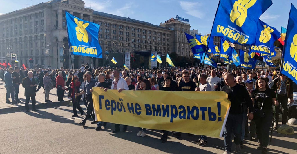 Once they reached the Maidan, the marching crowds turned up Heroes of the Heavenly Hundred Street, passing the spot where sniper fire felled scores of protesters during the final days of the pro-democratic revolution in 2014.
