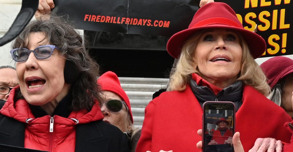 Later in the day, for two hours, seven of the protesters reportedly chained themselves to the door of a Wells Fargo bank branch, preventing customers from entering. Cheered on by octogenarian actress Jane Fonda—a longtime agitator who never met a leftist cause she didn’t reflexively support—demonstrators mindlessly chanted, “Wells Fargo, hey, you! / We deserve a future, too.” (Just as an aside, what’s with the left’s obsession with rhyming couplets?)