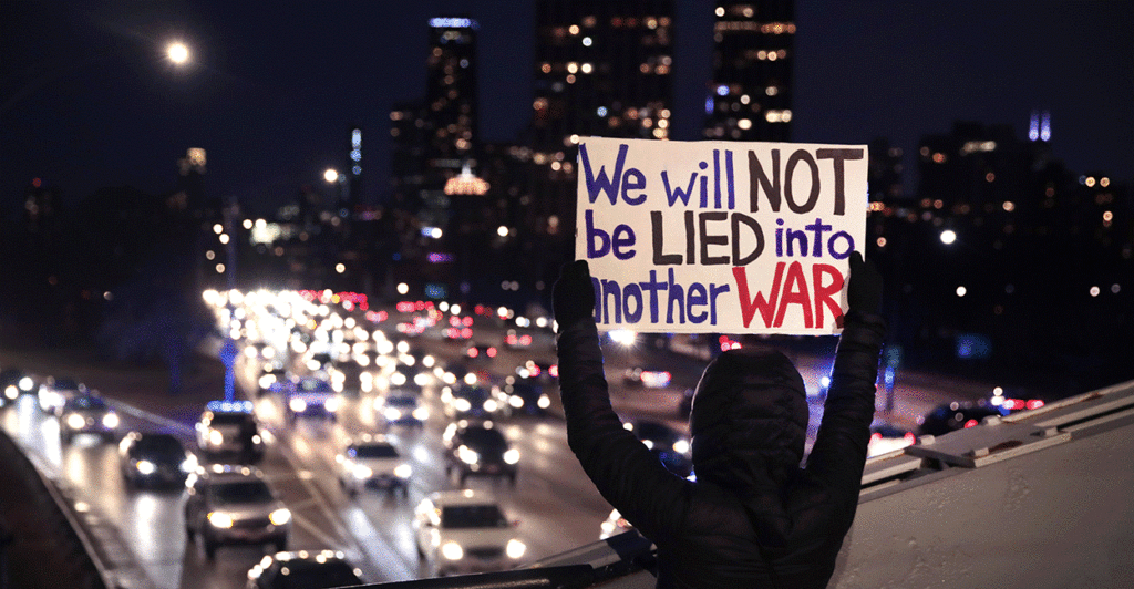 Demonstrators protest the possibility of war with Iran from a pedestrian bridge over Lake Shore Drive in Chicago during rush hour Jan. 9, 2020. The House adopted a War Powers Resolution Thursday with the aim of limiting President Donald Trump’s military actions against Iran. (Photo: Scott Olson/Getty Images)