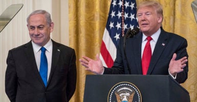 “You recognize that Israel must have sovereignty in places that enable Israel to defend itself by itself,” Netanyahu said. “For too long, far too long, the land of Israel where our patriarchs prayed, our prophets preached, and our kings ruled has been outrageously branded as an illegally occupied territory.”