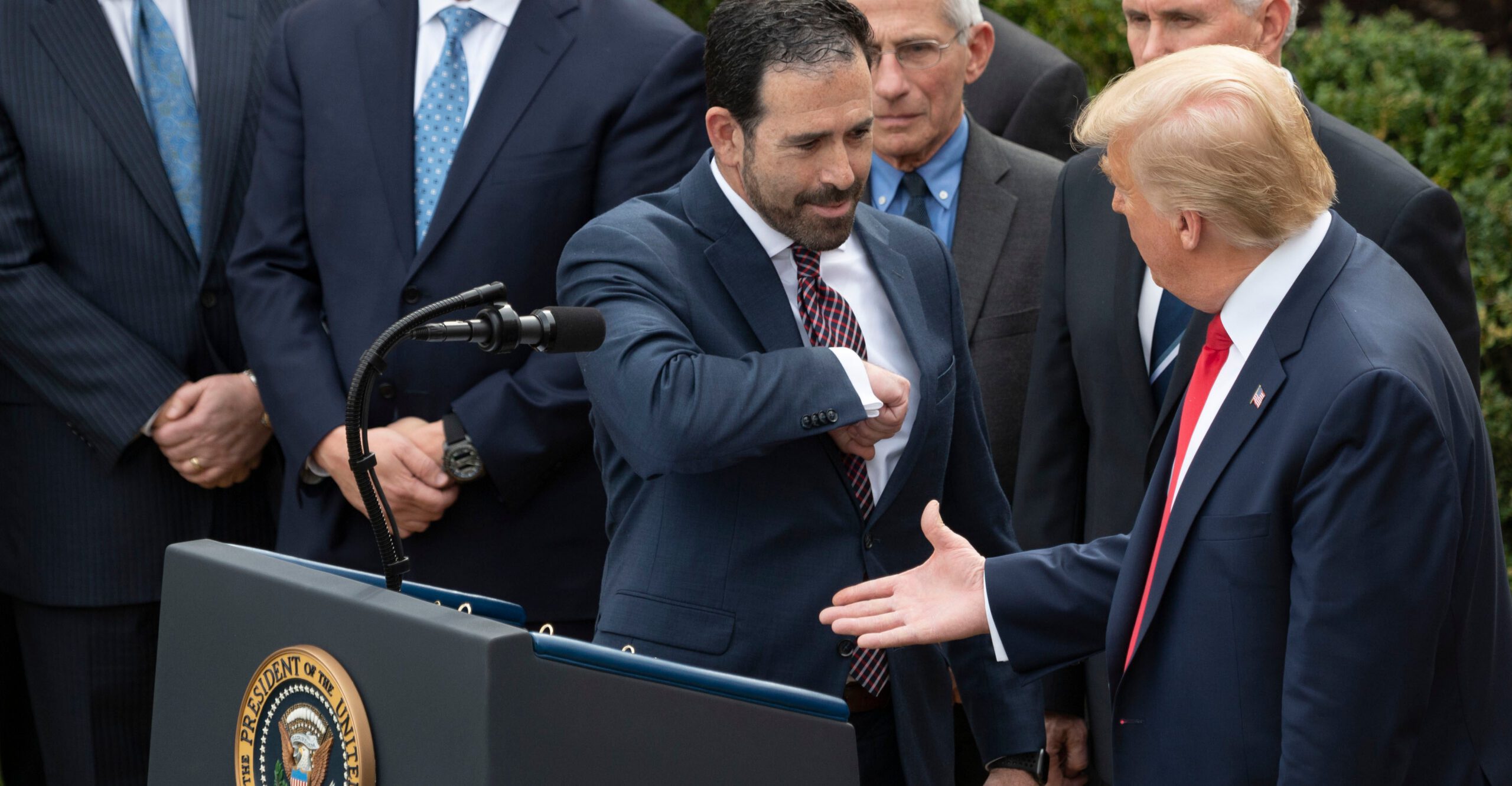 Flanking the president were several business CEOs and top administration officials who are part of the White House’s coronavirus task force.