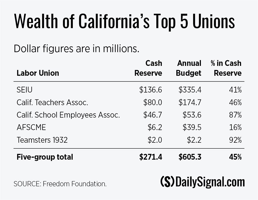 He points to financial records of the state’s five largest public-sector unions that show they maintain roughly 45% of their yearly income in cash reserves: