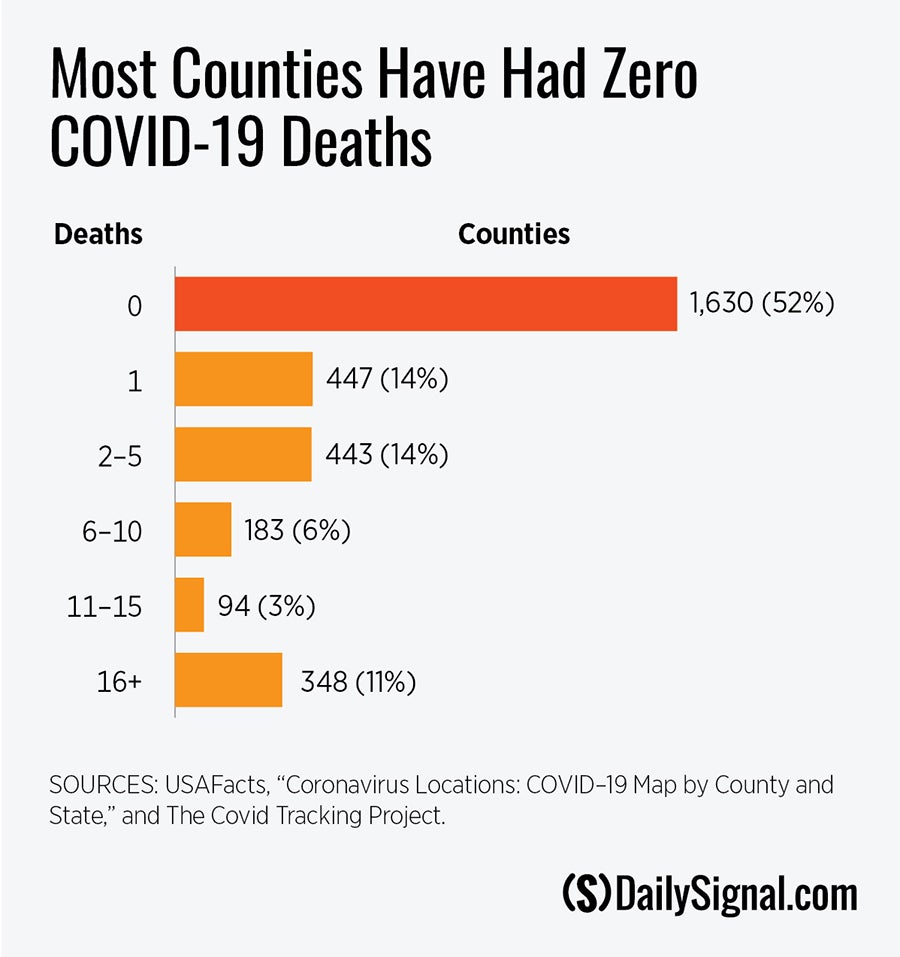 The chart also illustrates that 66% of all U.S. counties have no more than one coronavirus death, 80% have five or fewer, 86% have 10 or fewer, and 89% have fewer than 15.