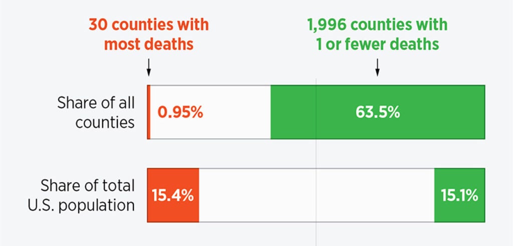 The 30 counties with the most COVID-19 cases, for example, account for 48% of all the cases in the U.S. and 55% of all deaths, three to four times greater than their 15% share of the U.S. population.