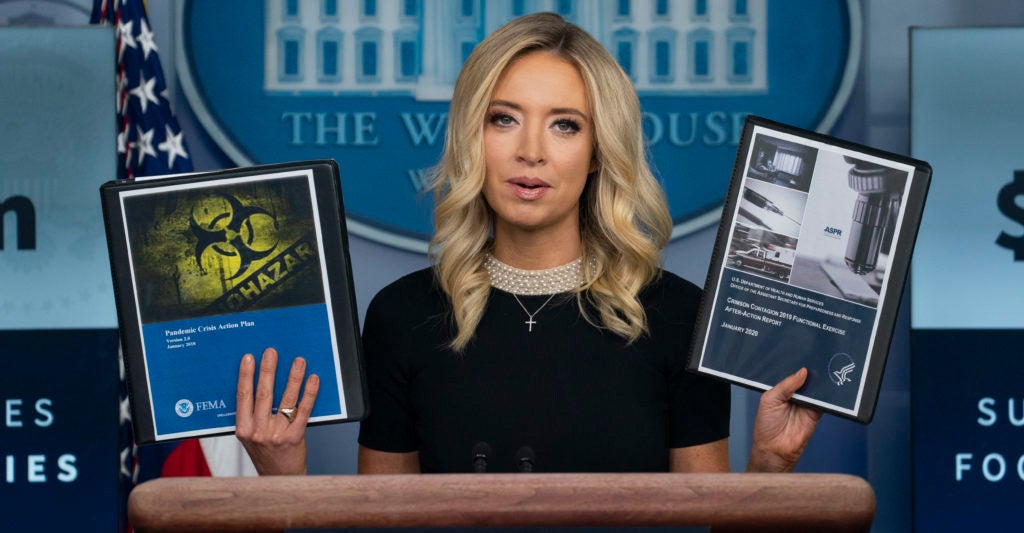 White House press secretary Kayleigh McEnany said Friday that the playbook from the Obama administration was an insufficient packet of paper, and that the Trump administration’s own pandemic response exercise in 2019 exposed its shortcomings.