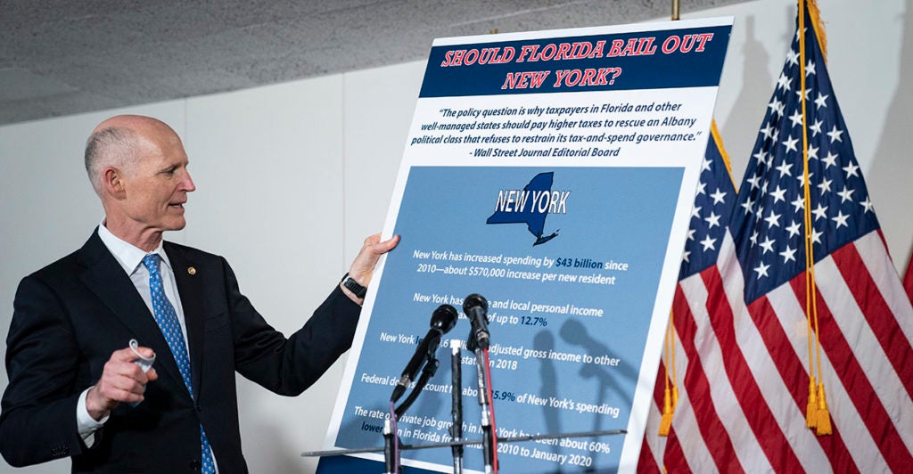 Sen. Rick Scott, a Florida Republican, is one of the voices in Congress speaking out against state bailouts, calling the funding “a piggy bank for unrelated expenses that have nothing to do with responding to the coronavirus.”