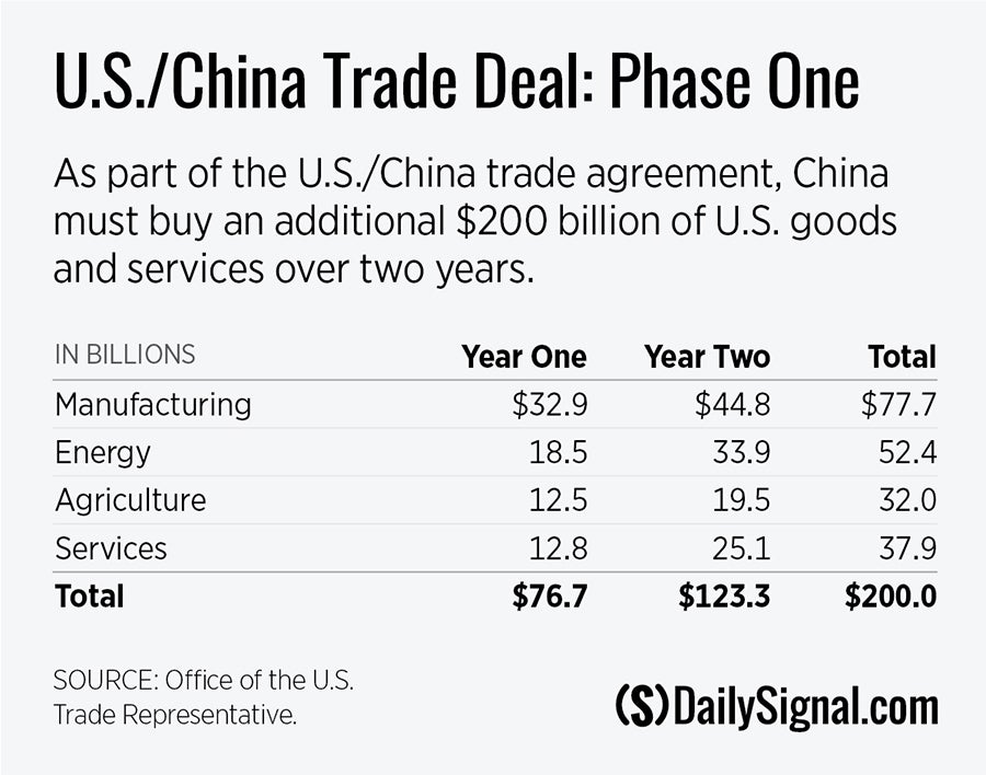 What China must purchase is spread across agricultural, manufactured, and energy goods, and it must purchase those additional goods within two years.