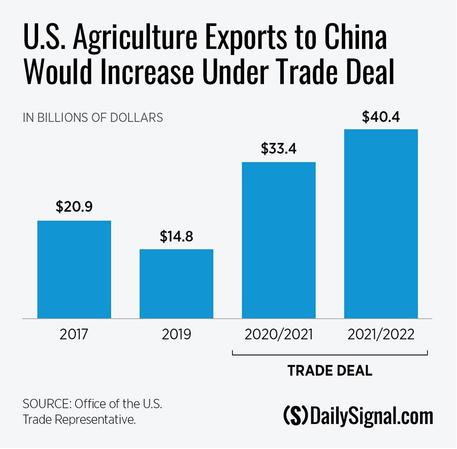 That means China must purchase $12.5 billion worth of additional agriculture goods in the first year, and $19.5 billion in the second year, on top of the $20.9 billion worth of agriculture goods exported in 2017, for a grand total of $73.8 billion worth of agricultural exports. That’s an amount far above previous heights for U.S. agriculture exports.