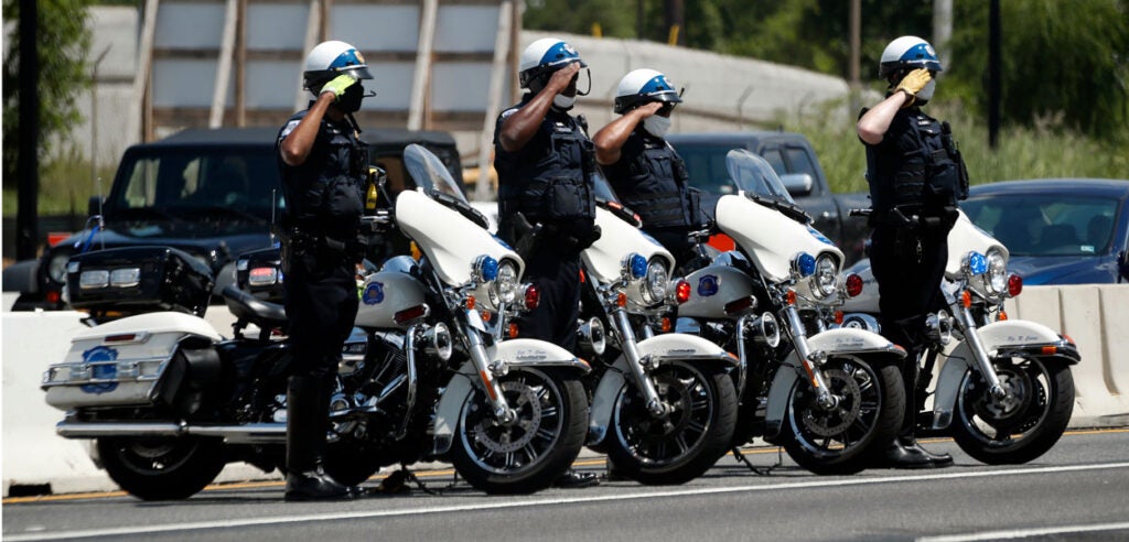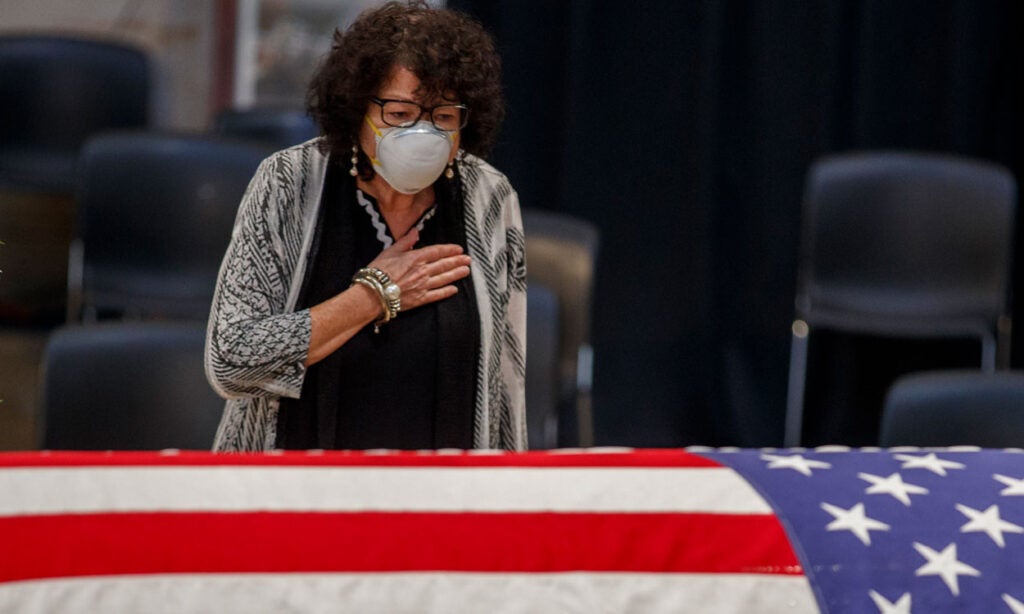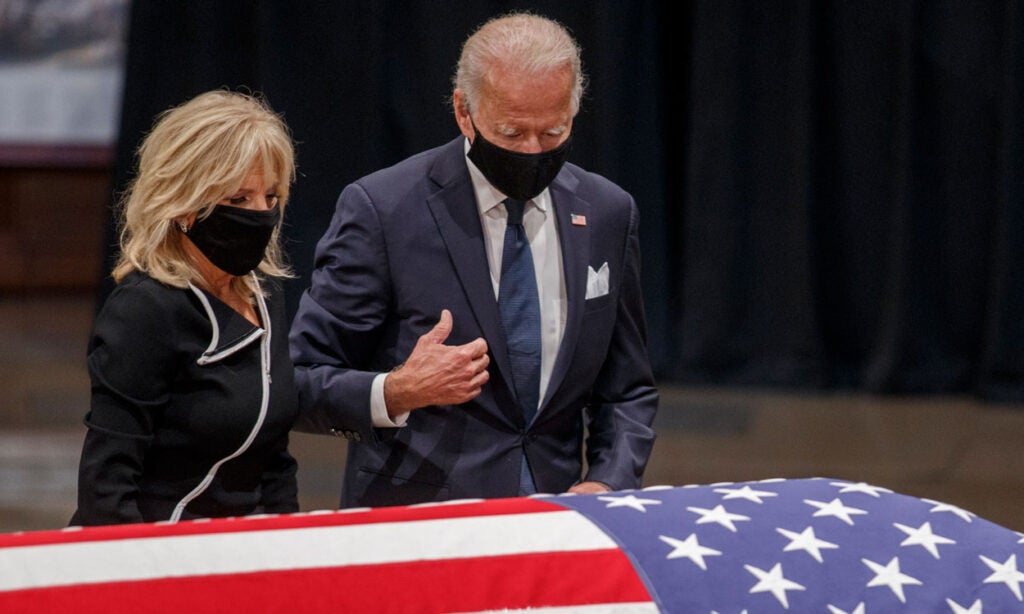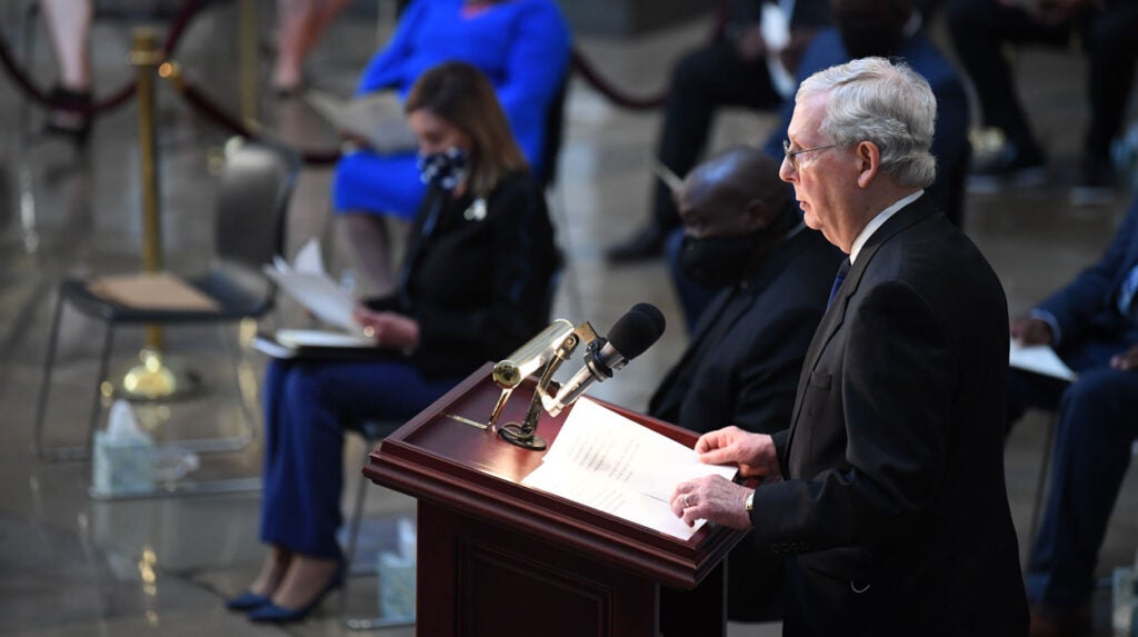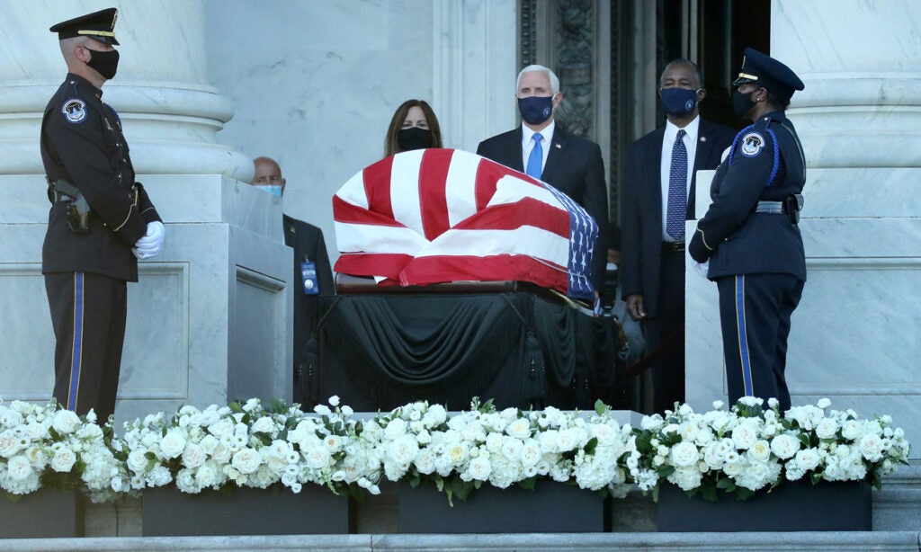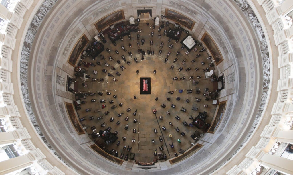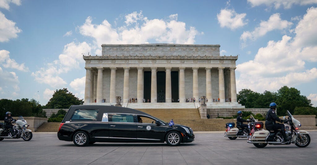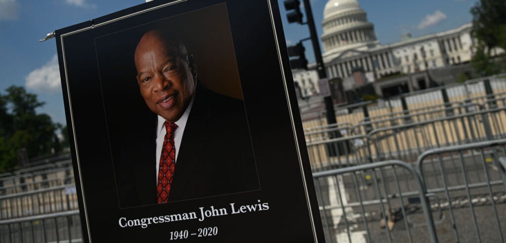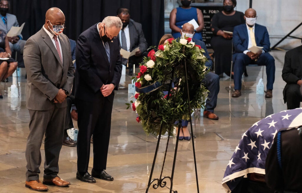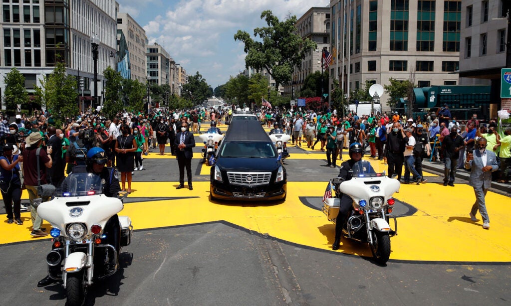 A photo of Rep. John Lewis, D-Ga., appears near security barriers set up for the public viewing later Monday at the Capitol. (Photo: Andrew Caballero-Reynolds/AFP/Getty Images)The flag-draped casket bearing Lewis’ body is moved from a military plane by a joint services honor guard to a waiting hearse upon arrival at Joint Base Andrews in Maryland for the motorcade to the Capitol. (Photo: Alex Brandon/Pool/Getty Images)Officers with the Metropolitan Police Department salute as the Capitol-bound motorcade goes by in Washington. (Photo: Alex Brandon/Pool/Getty Images)The hearse moves through Black Lives Matter Plaza, a newly renamed stretch of 16th Street near the White House, the site of Lewis’ last public appearance. (Photo: Alex Brandon/Pool/Getty Images)Senate Majority Leader Mitch McConnell, R-Ky., speaks at the beginning of the congressional memorial service for Lewis in the Rotunda, while House Speaker Nancy Pelosi, D-Calif., consults notes. (Photo: Matt McClain/Pool/AFP/Getty Images)Lewis’ loved ones wait as the military honor guard carries his casket up the steps at the Capitol. (Photo: Brendan Smialowski/Pool/AFP/Getty Images)The hearse and police escort stop briefly in front of the Lincoln Memorial on the way to the Capitol. (Photo: Drew Angerer/Getty Images)A bird’s eye view of the congressional memorial service as Lewis’ body lies in state at the center of the Capitol Rotunda. (Photo: Jonathan Ernst/Pool/Getty Images)Construction workers record a bit of history on their smartphones as the hearse carrying Lewis’ casket passes them in Washington. (Photo: Alex Brandon/Pool/Getty Images)Sen. Tim Scott, R-S.C., left, and Senate Minority Leader Chuck Schumer, D-N.Y., pay their respects in the Rotunda after presenting a wreath in Lewis’ honor. (Photo: Michael A. McCoy/Pool/Getty Images)Supreme Court Justice Sonia Sotomayor says goodbye to Lewis in the Rotunda. (Photo: Shawn Thew/Pool/AFP/Getty Images)Former Vice President Joe Biden and his wife Jill linger at Lewis’ casket. (Photo: Shawn Thew/Pool/AFP/Getty Images)Vice President Mike Pence and his wife Karen attend Lewis’ casket after it is moved to the top of the Capitol’s East Front. (Photo: Chip Somodevilla/Getty Images)