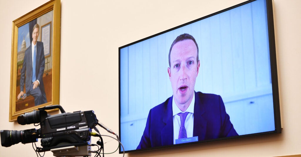 Mark Zuckerberg of Facebook, Tim Cook of Apple, Jeff Bezos of Amazon, and Sundar Pichai of Google testified via the internet on free speech concerns before the House Judiciary Committee’s subcommittee on antitrust, commercial, and administrative law.