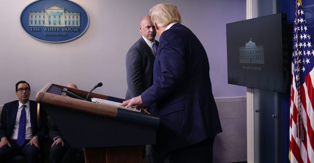A few minutes into a press briefing Monday evening, President Donald Trump calmly walked away from the lectern after a Secret Service agent interrupted him and whispered a few words.