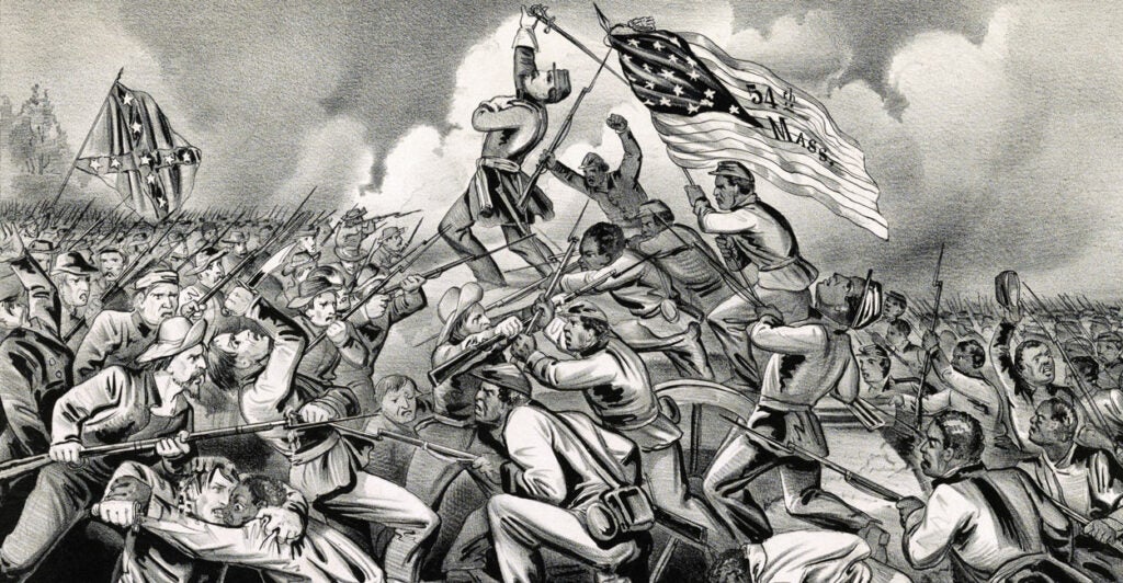 Carney’s regiment, the 54th Massachusetts Infantry, had been tasked with serving as the spearhead of the Union assault. As the bullets whistling past claimed the life of the color sergeant, Carney picked up the flag and led the assault on the Confederate position.