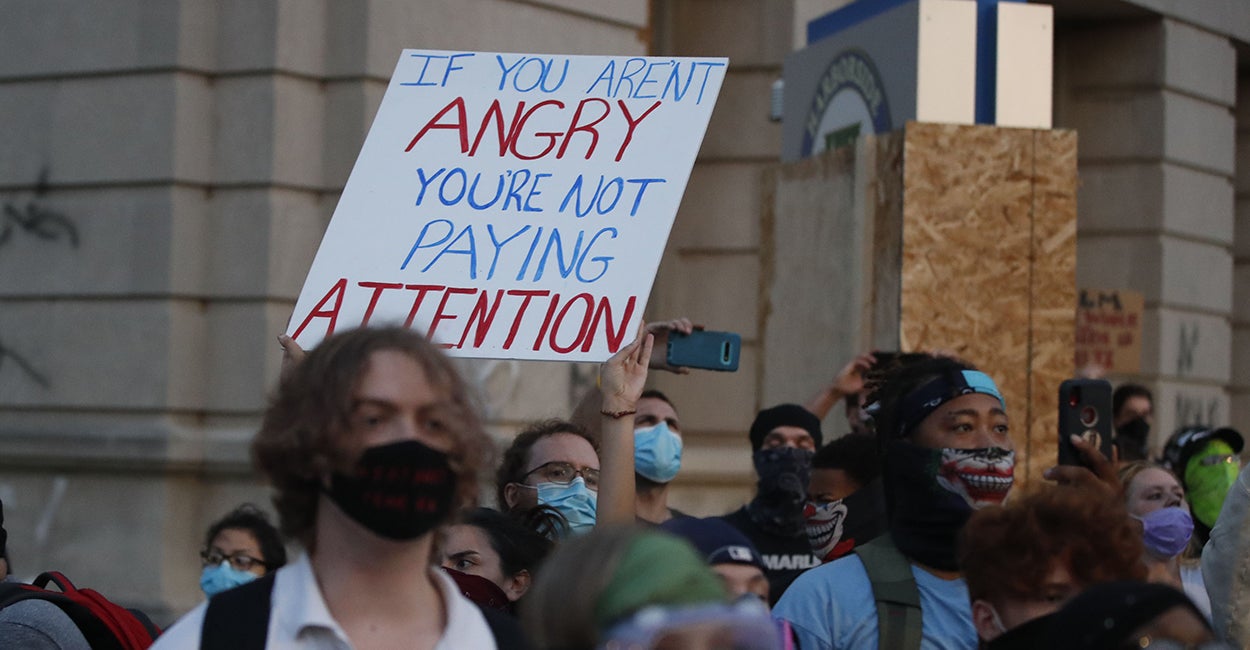 The man, who has his back to the camera, leans down toward the woman’s face as the crowd continues to chant “white silence is violence” and “no justice, no peace.”