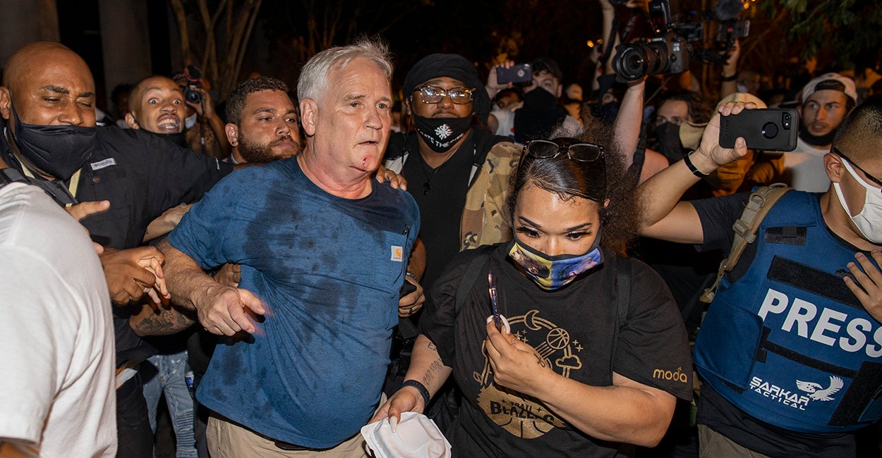 Earlier in the night, an elderly man was harassed and knocked to the ground as he tried to walk through the protests.