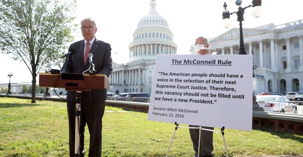 True, in 2016, when Justice Antonin Scalia died, now-Senate Majority Leader McConnell never gave Obama’s nominee a hearing. Some Republicans pointed to the so-called [Joe] Biden rule that supposedly says Supreme Court nominations should not be considered during a presidential campaign year.
