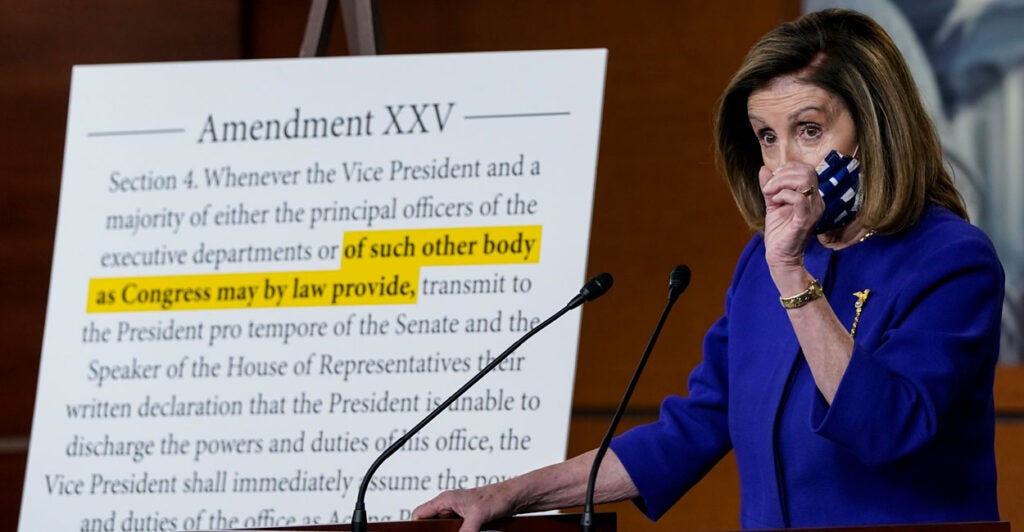 The Pelosi version would create a 16-member commission, with half of its members appointed by Republican and Democratic congressional leaders, to monitor the president’s fitness for office and, if necessary, play the role contemplated by the 25th Amendment.
