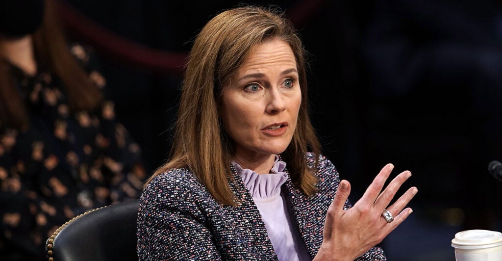 - Barrett, President Trump’s third nominee to the Supreme Court, declines to comment on whether a president could pardon himself or herself.