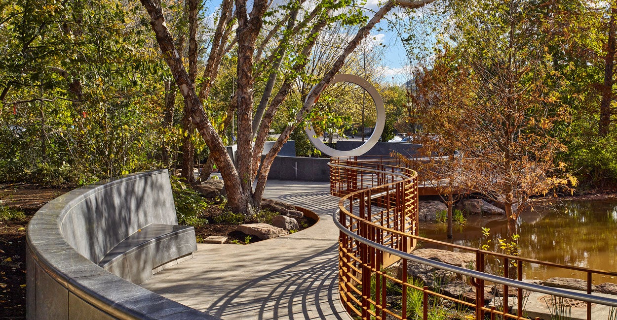 Its designers intentionally incorporated water for sacred ceremonies, benches for reflection, and lances for visitors to tie prayer cloths. Its design is meant to establish the memorial as a gathering place for peace and community—values deeply engrained in the Native American community and this country as a whole.