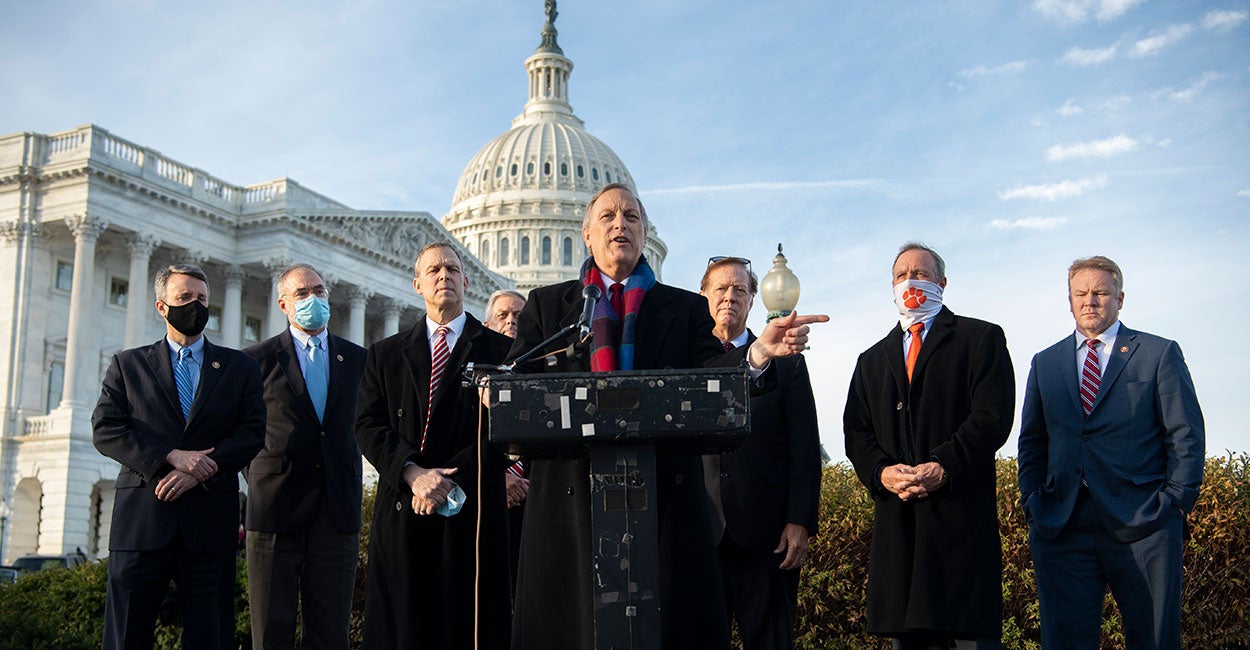 “We represent millions of Americans who do not have confidence in the outcome of this election, not because of the clear winner, but because of irregularities in the voting process,” Rep. Warren Davidson, R-Ohio, said Thursday during a House Freedom Caucus press conference outside the Capitol.