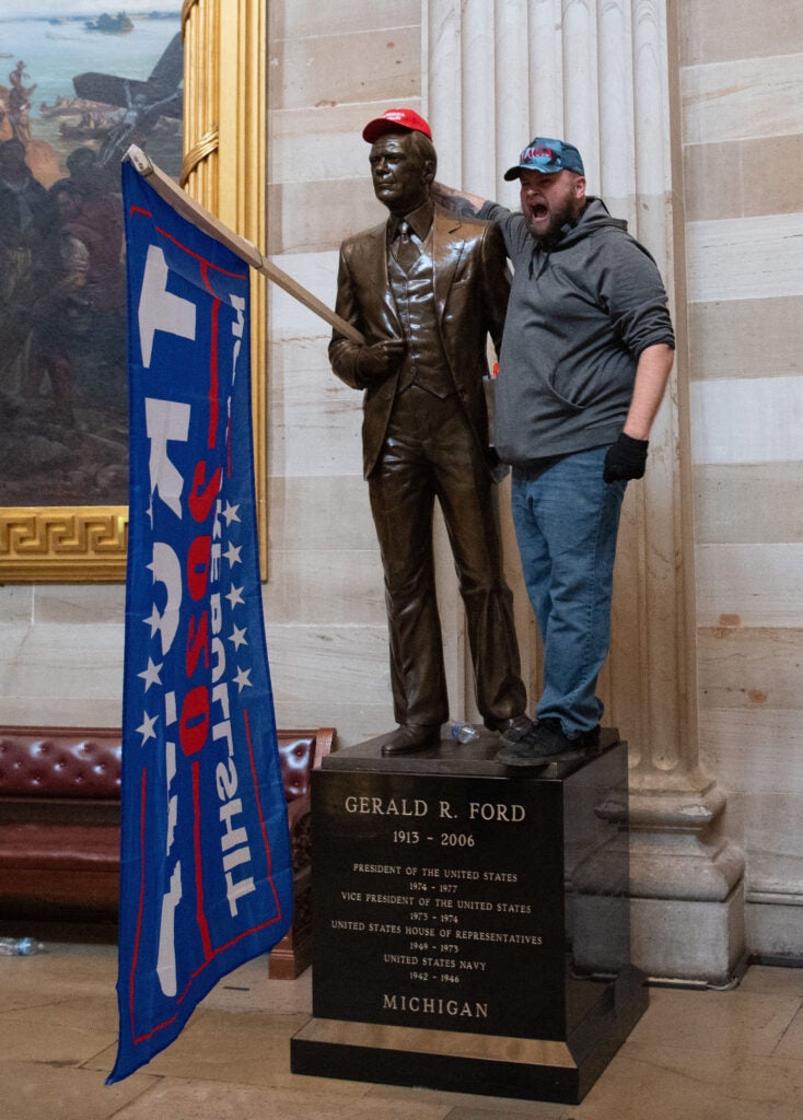 A man poses with a statue of former President Gerald Ford, who served in the House, in the Capitol Rotunda. (Photo: Saul Loeb/AFP/Getty Images)