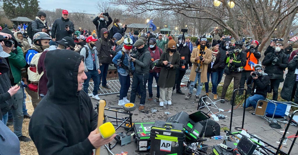 Damaged equipment of media crews outside the Capitol during clashes after protesters breach the building. (Photo: Tayfun Coskun/Anadolu Agency /Getty Images)