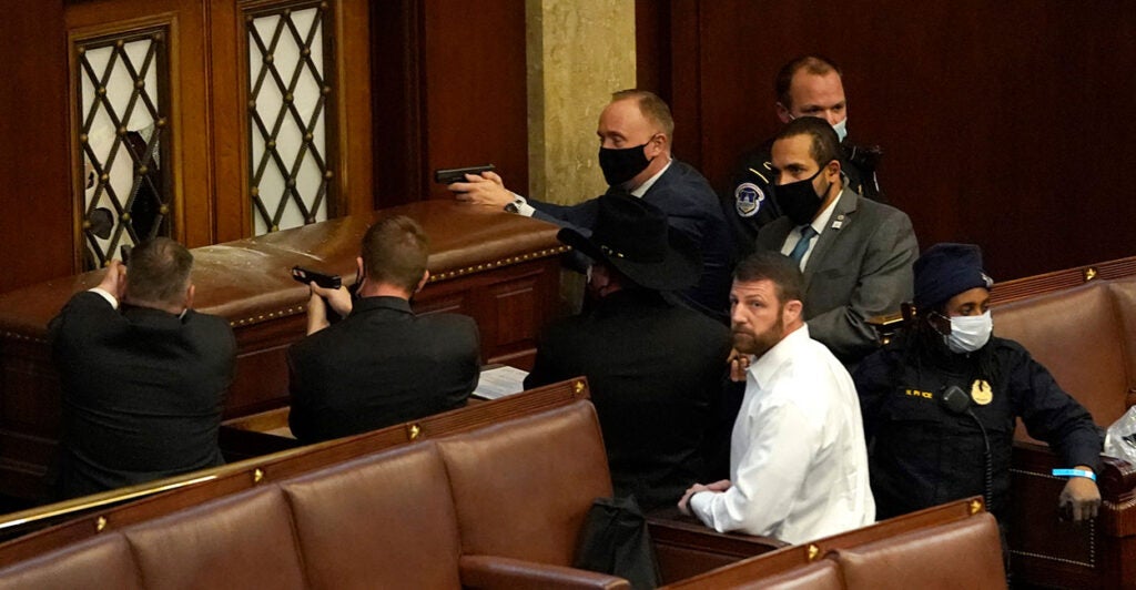 Capitol Police officers and Secret Service agents point guns at intruders outside the vandalized doors to the House Chamber. (Photo: Drew Angerer/Getty Images)