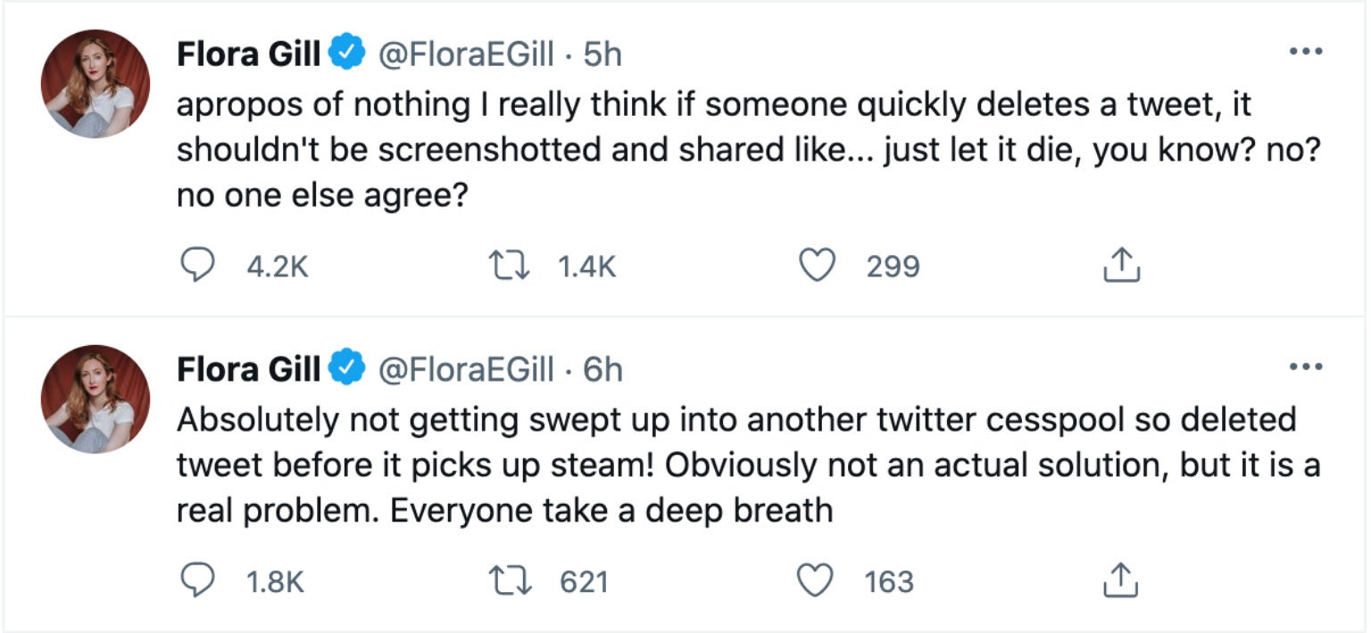 Gill then tweeted: “Apropos of nothing I really think if someone quickly deletes a tweet, it shouldn’t be screenshotted and shared like… just let it die, you know? no? no one else agree?”