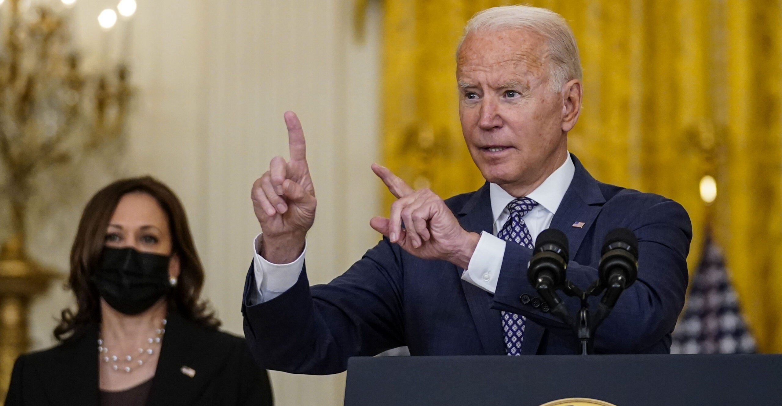 While speaking and taking a few questions from reporters in the East Room of the White House, Biden was flanked by Vice President Kamala Harris, Secretary of State Antony Blinken, Defense Secretary Lloyd Austin, and national security adviser Jake Sullivan.
