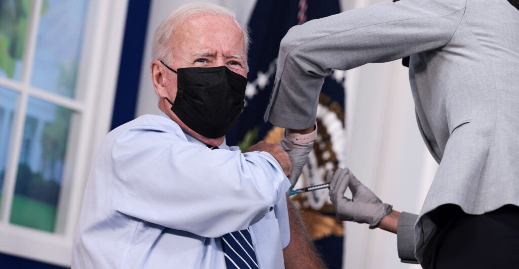 Jokers on Facebook showed a photograph of Biden getting his booster vaccination in the South Court Auditorium in front of a set that resembled the Oval Office. One said, “Joe Biden using a fake White House backdrop is so on brand for him.” Another Facebook post said, “They created a fake set for Biden to get his booster shot. The entire Biden presidency is one giant charade.”