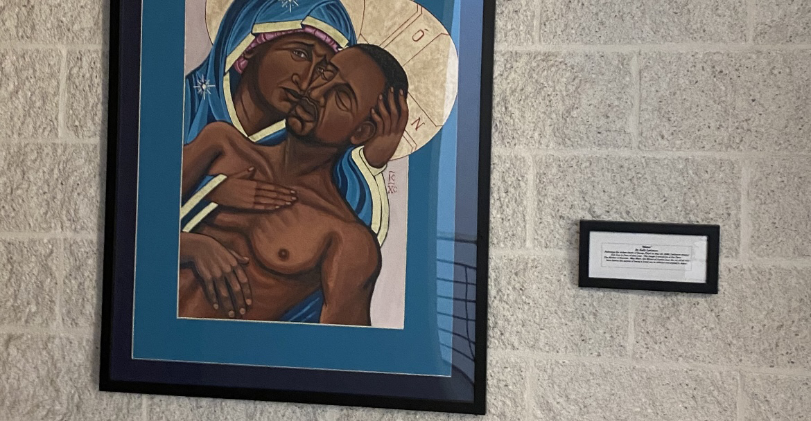 “Mama” hangs right outside the Mary, Mirror of Justice Chapel in Catholic University’s Columbus School of Law and emulates the renowned “Pieta,” a statue carved by Italian sculptor Michelangelo Buonarroti in 1499 depicting Jesus Christ’s mother, Mary, holding him in her arms after his crucifixion.