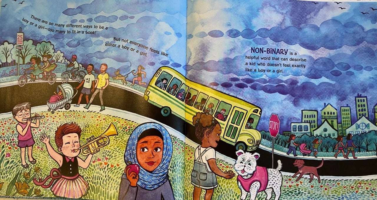 “But not everyone feels like either a boy or a girl,” the author writes. “Non-binary is a helpful word that can describe a kid who doesn’t feel exactly like a boy or a girl.”