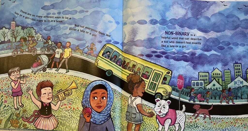 “But not everyone feels like either a boy or a girl,” the author writes. “Non-binary is a helpful word that can describe a kid who doesn’t feel exactly like a boy or a girl.”