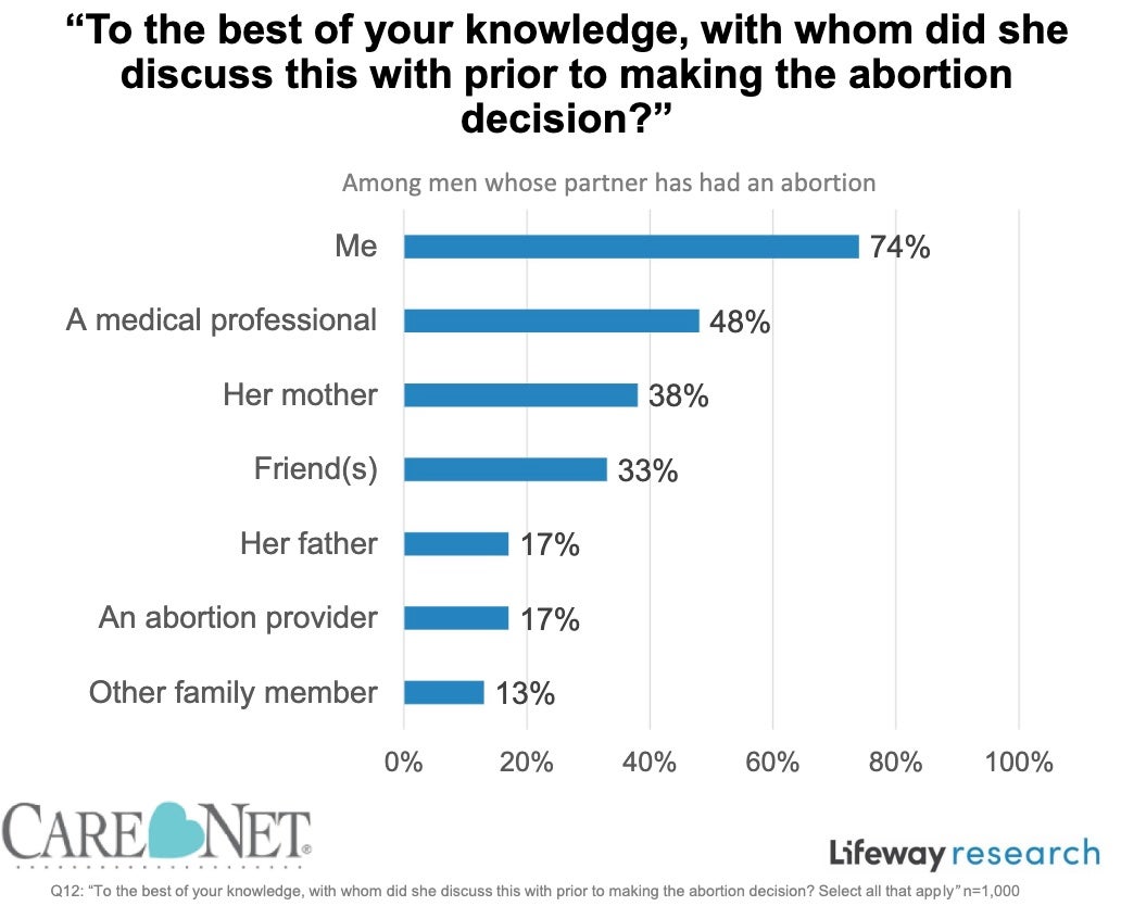 Care Net released the finding of a Feb. 25-March 26, 2021, survey of 1,000 American men whose spouse or partner had had an abortion. Findings show that roughly 3 out of every 4 men, or 74%, said their partner talked with them about getting the abortion before going through with it.