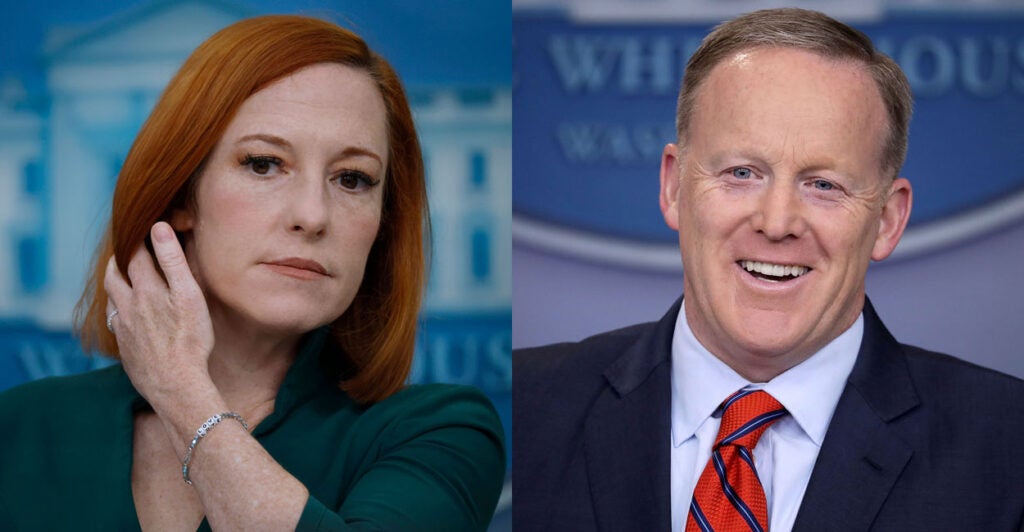 Spicer: Right. This is unprecedented. With all due respect, I’m glad Jen’s got a new job. It’s a tough job being press secretary. I wish her all the best. I’m glad that she’s found a soft landing, and I think that’s great, and I honest to God mean it. She was very helpful to me, Josh Earnest and her, when I was transitioning [to White House press secretary in 2017], so I wish her the best.