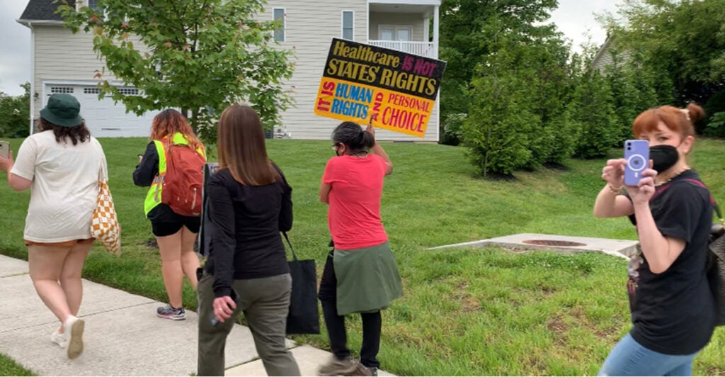The small group carried two pro-abortion signs and chanted “your neighbor says post-Roe, we say hell no,” and “they say no choice, we say pro-choice” as they walked through the Falls Church, Virginia neighborhood, about 12 miles outside of Washington, D.C.
