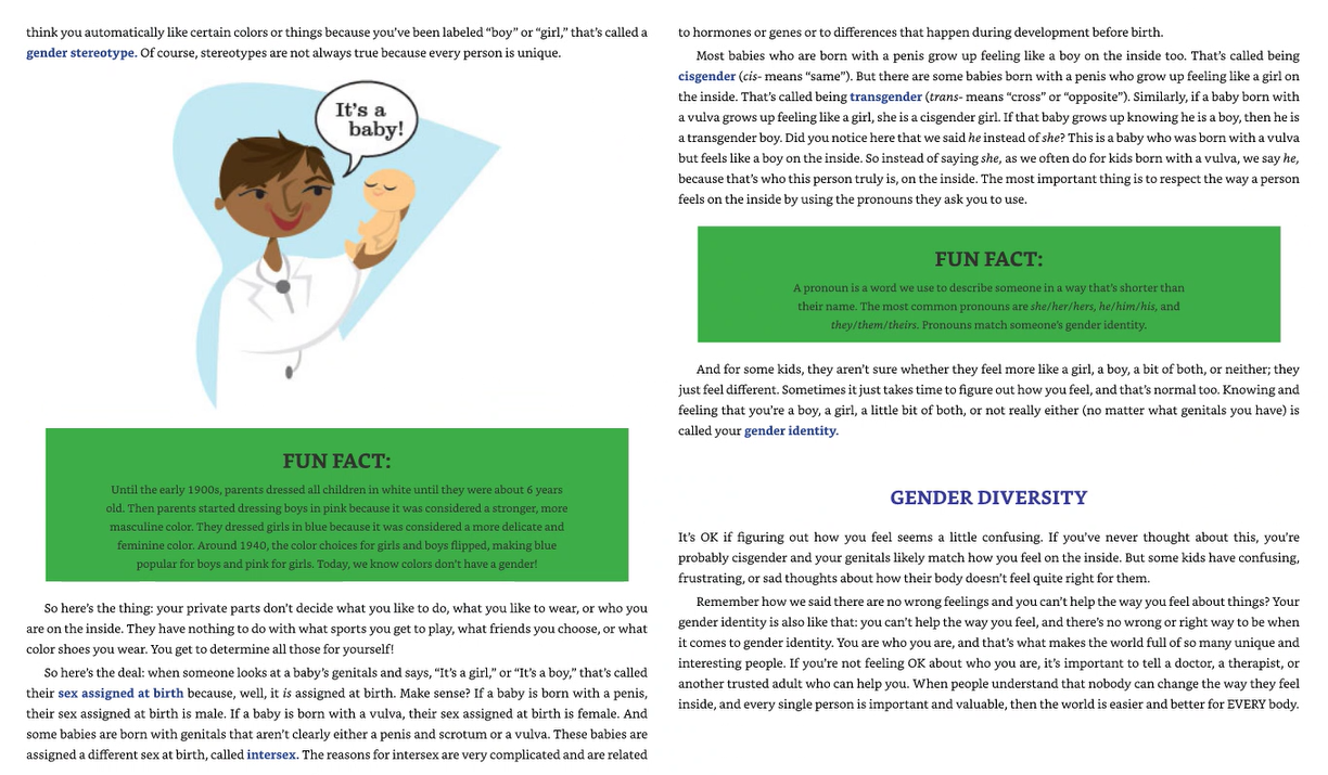 The chapter goes on to argue that sex isn’t related to what genitals a baby has, and that it’s all about how someone identifies. Worse, the book goes on to describe how there aren’t two genders, but a whole multitude.