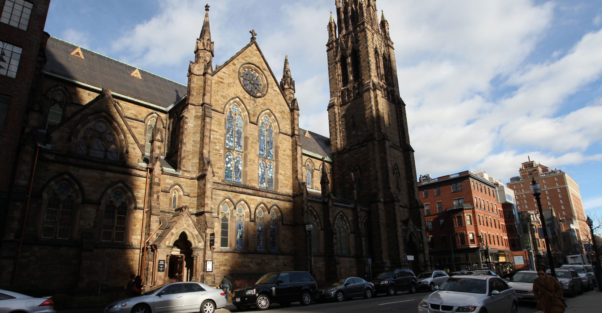 On the front of one of the oldest and most beautiful churches in the country, the Church of the Covenant in Boston, hangs a large banner on which is written: