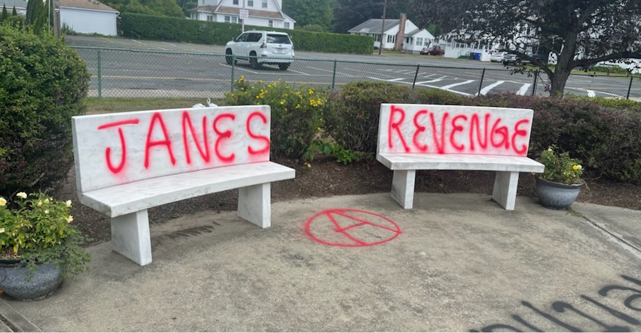 Someone also wrote the words “Janes Revenge” [sic] in red paint on two white marble benches outside the center.