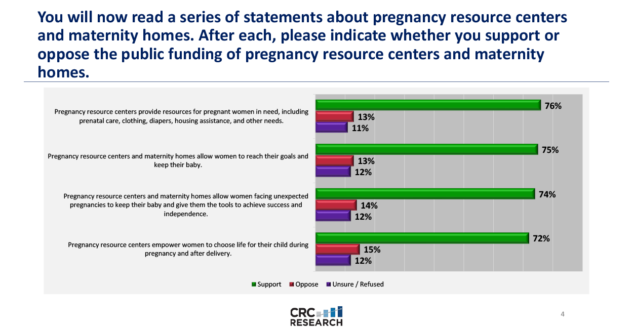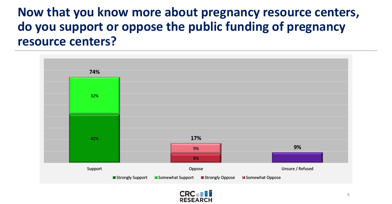 Nearly 80% of Republican respondents, 72% of independent respondents, and 73% of Democrat respondents support public funding of pregnancy resource centers, according to the poll.