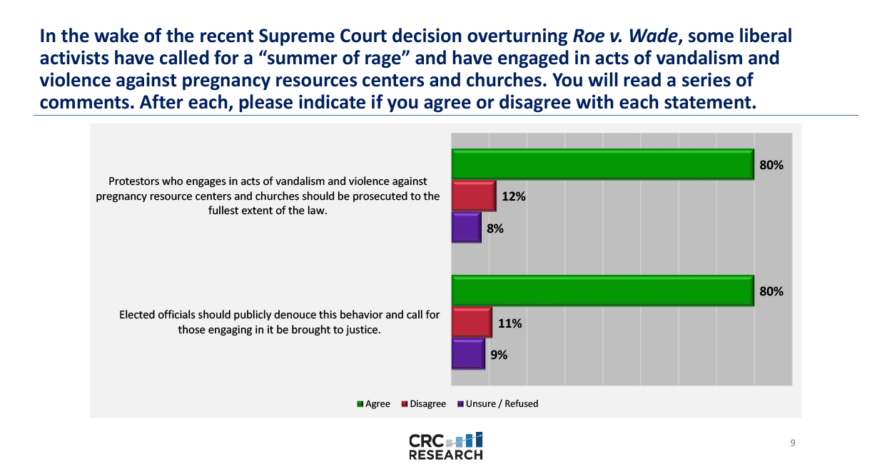 Eighty percent of the respondents support the prosecution of protesters who “[engage] in acts of vandalism and violence against pregnancy resource centers and churches,” the poll found.