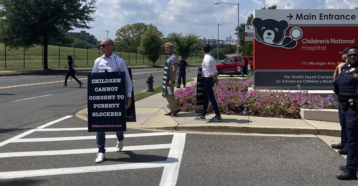 Chris Elston stood in the 90-degree heat outside Children’s National Hospital in Washington, D.C., wearing a billboard with the message: “Children cannot consent to puberty blockers.”