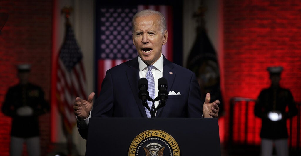 President Joe Biden’s bitter, loathsome speech in Philadelphia earlier this month, replete with ruby-red aesthetic stage accoutrements that would make Leni Riefenstahl proud, pours mountains of gasoline on this already-raging conflagration.