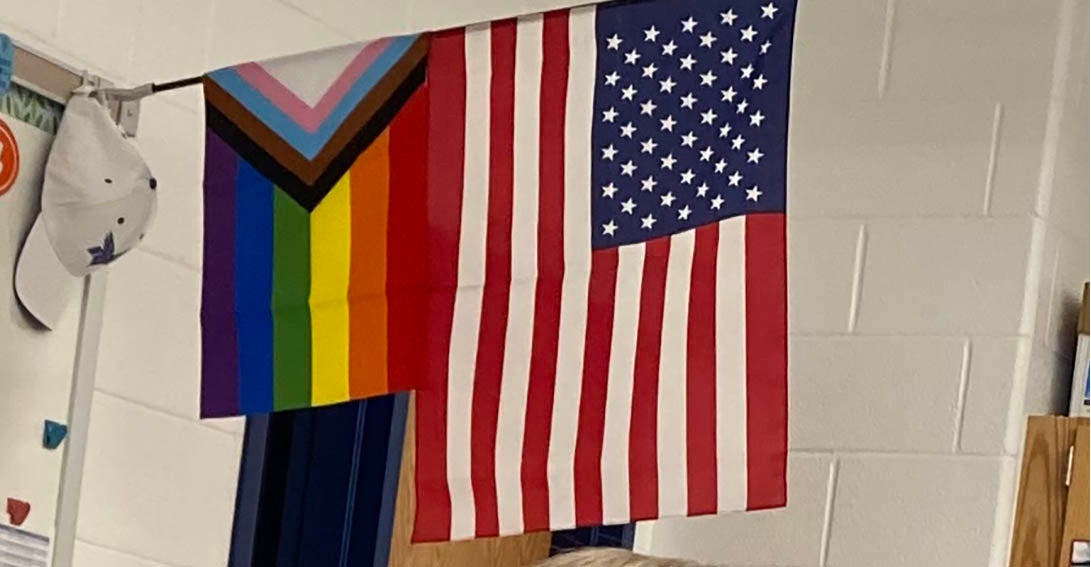 A rainbow or transgender flag was on display in each of her son’s seven classes, she told The Daily Signal. Such “pride flags” hung on the same poles as American flags at the school.