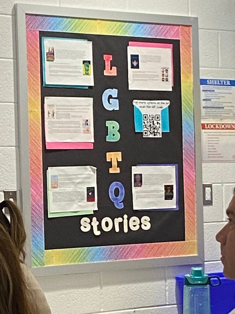 The lone bulletin board in one classroom was given over to what decorative letters described as “LGBTQ stories,” she said.