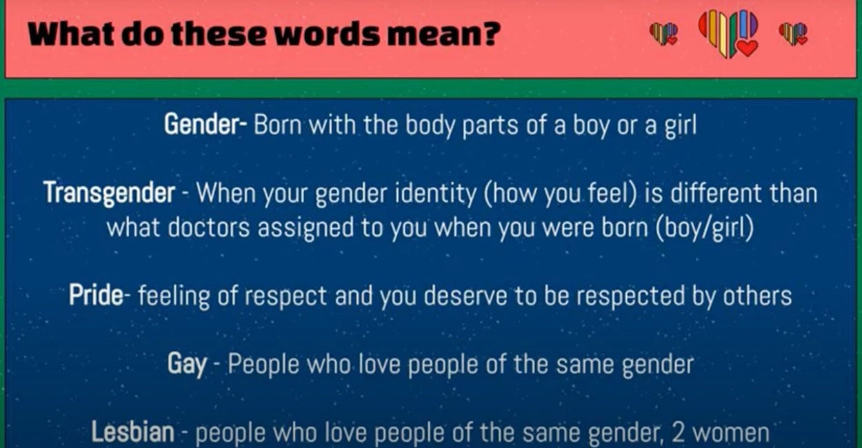 She goes on to share some “fun facts” about Pride Month, including feeling-based definitions for a list of words such as gender, transgender, pride, gay, and lesbian.